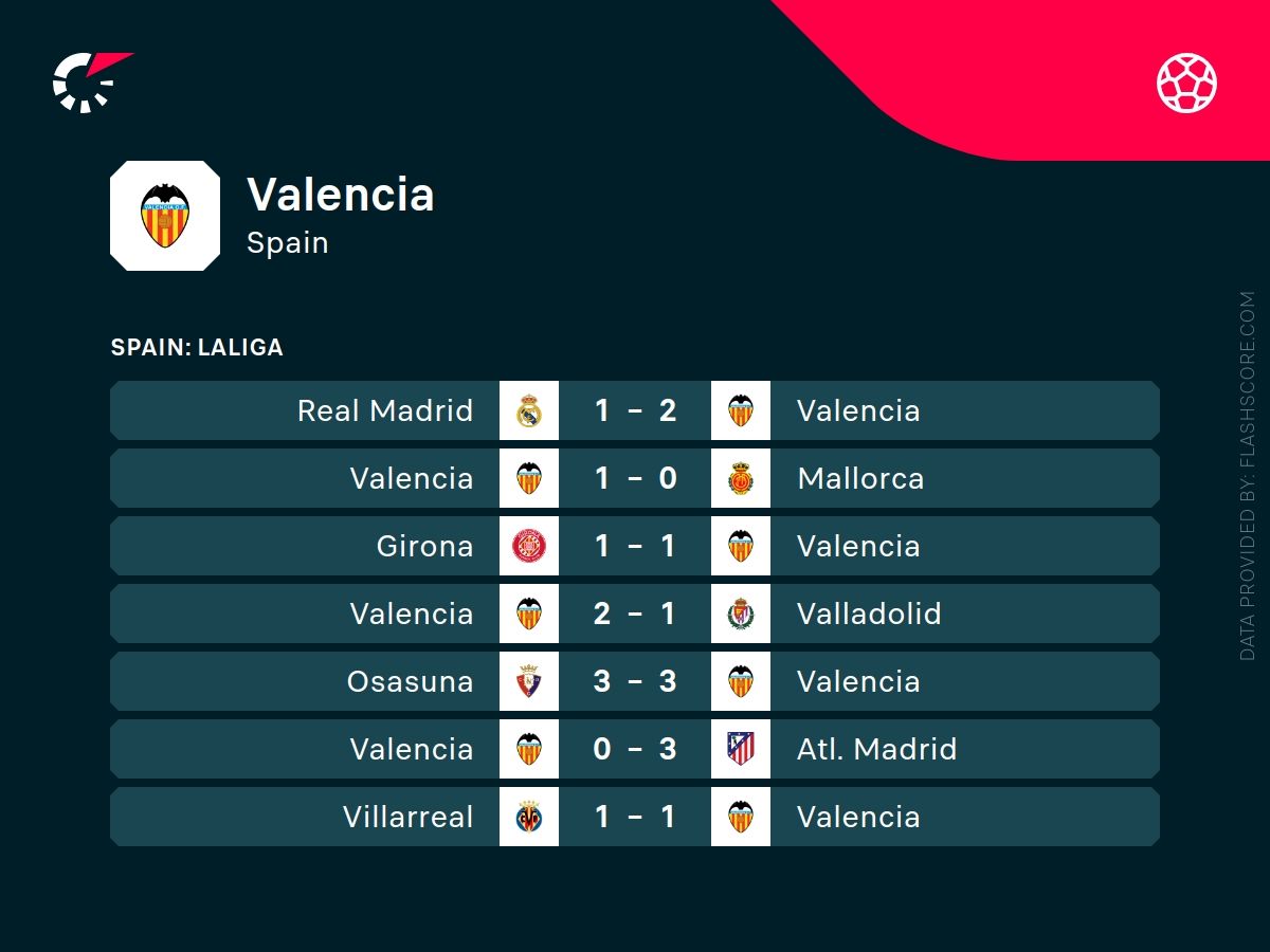 Valencia jest w dobrej formie, wygrała trzy z ostatnich pięciu spotkań, dwa pozostałe remisując. Na szczególną uwagę zasługuje triumf nad Realem Madryt, głównie dzięki fenomenalnemu występowi bramkarza Giorgiego Mamardaszwilego. W jedynie trzech z ostatnich siedmiu spotkań, zdobyli więcej niż jedną bramkę.