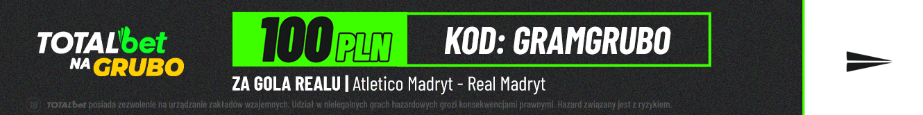 Jeżeli jeszcze nie korzystałeś z usług bukmachera Totalbet, to właśnie teraz jest doskonały moment, aby założyć u niego konto i wykorzystać przy okazji kod promocyjny Totalbet. Obecnie bukmacher ten proponuje freebet 100 PLN jeśli Real strzeli przynajmniej jedną bramkę w półfinałowym meczu Superpucharu Hiszpanii z Atletico. Przypomnę, że w spotkaniu tym zobaczymy Real, który w niedzielę strzelił pięć bramek solidnemu Betisowi. Do zgarnięcia jest 100 PLN, a zatem polecamy skorzystać z okazji: