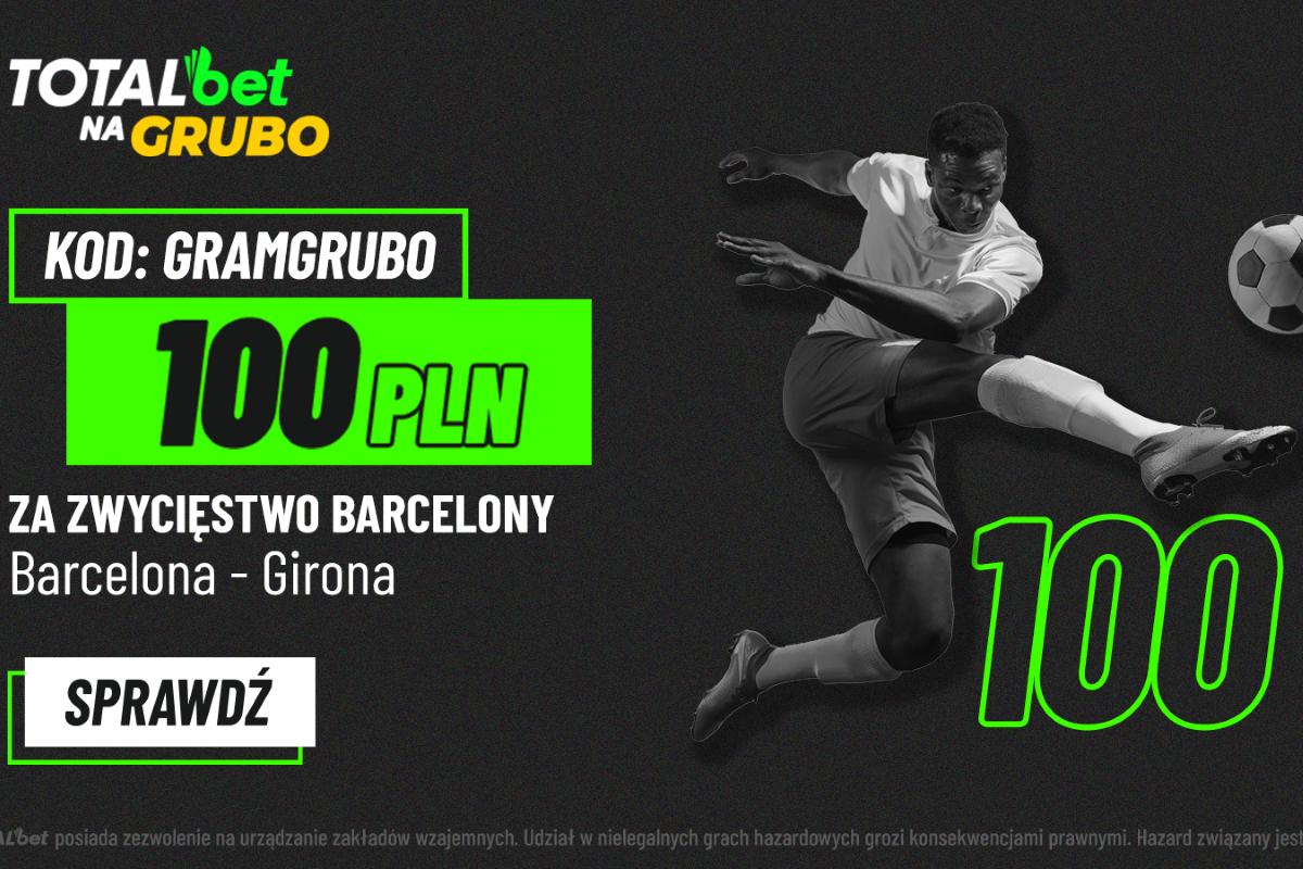 Jeżeli dotychczas nie zakładałeś konta u bukmachera Totalbet, to teraz jest idealna okazja do rejestracji i skorzystania ze specjalnej promocji! Wykorzystując nasz kod promocyjny Totalbet zostaniesz zapisany do akcji promocyjnej, w ramach której obstawić możesz kupon na wygraną FC Barcelony z Gironą i zgarnąć aż 100 zł bonusu za trafienie takiego kuponu. Za momencik odszukasz dokładną instrukcję skorzystania ze wspomnianej oferty.