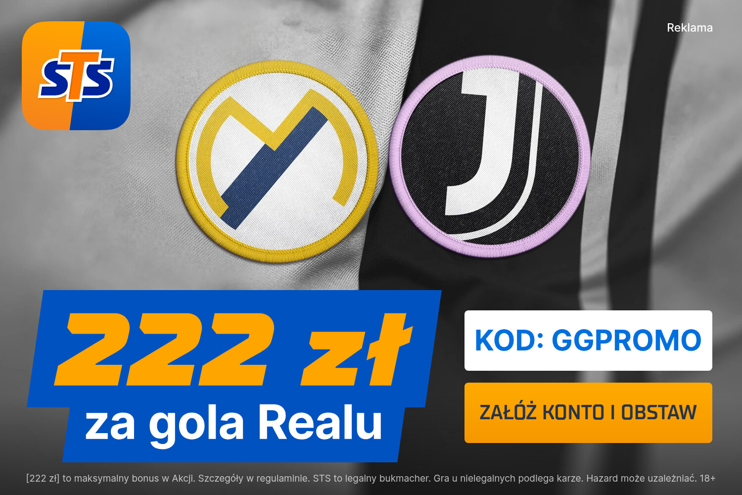 Bukmacher STS przy okazji starcia Real Madryt – Juventus zdecydował się zaproponować specjalną akcję promocyjną dla nowych graczy. Obecnie wykorzystując nasz kod promocyjny STS będziesz w stanie zgarnąć aż 222 zł bonusu za trafienie dowolnego klubu. Jeżeli poprawnie obstawisz zakład na trafienie Królewskich lub Starej Damy, to oprócz regularnej wygranej zgarniesz ponad 2 stówki w bonusie!
