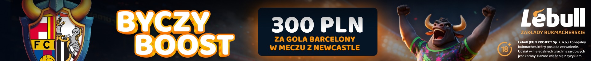 - Jeśli Barcelona strzeli gola w meczu z Newcastle, otrzymasz nagrodę w formie bonusu: 100 PLN (+20 zł freebetu) / 200 PLN / 300 PLN