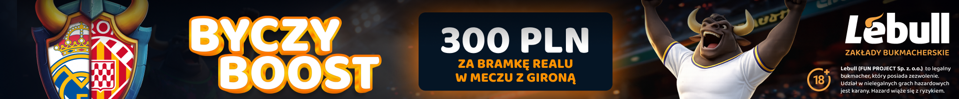 Przy współpracy z Lebull – czołowym podmiotem rankingu bukmacherów, mamy dla Was znakomitą promocję – 300 zł za sam fakt, że Real Madryt strzeli gola Gironie, a także dostęp do kolejnych etapów pakietu powitalnego. Więcej o bonusach od 2. i 3. depozytu przeczytasz w kodzie promocyjnym Lebull.