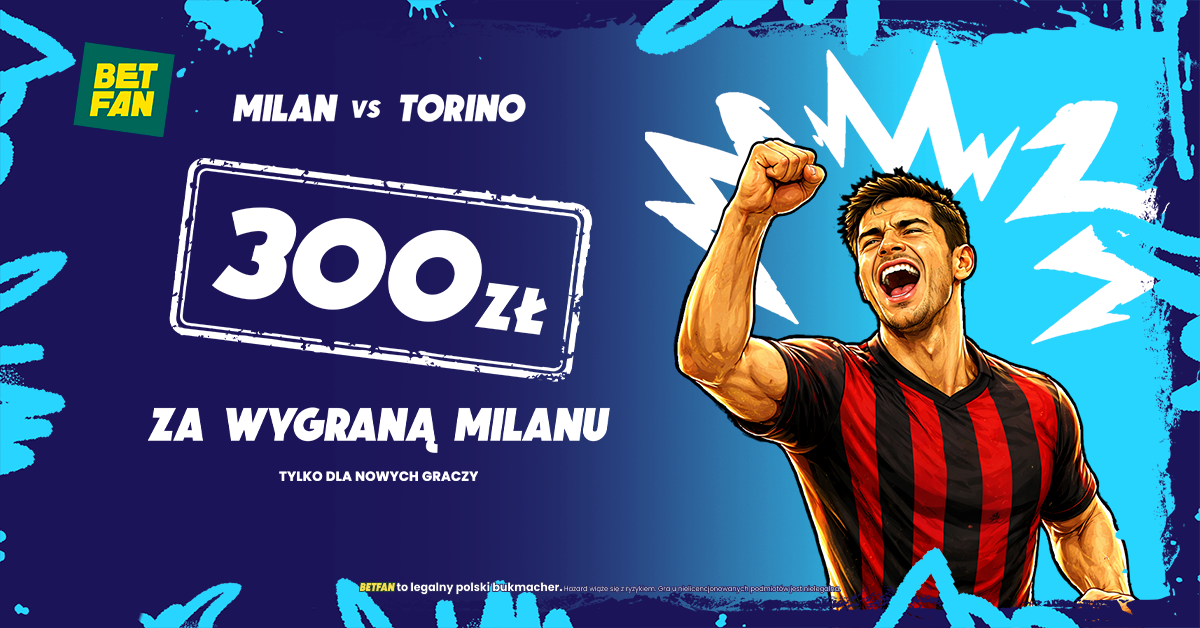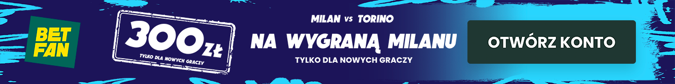 BETFAN przygotował z tej okazji specjalną promocję. Polski legalny bukmacher płaci aż 300 zł freebetu za wygraną Milanu z Torino. Co ciekawe, promocja łączy się z bonusem powitalnym, a więc otrzymasz bonus od depozytu i freebet 25 zł (przy wpłacie min. 75 zł)! Dodatkowo możesz skorzystać z bonusów 100% do 200 PLN także od drugiej i trzeciej wpłaty. Promocja dostępna jest dla nowych graczy, którzy założą konto z kodem GRAMGRUBO. To najwyższy bonus na rynku!