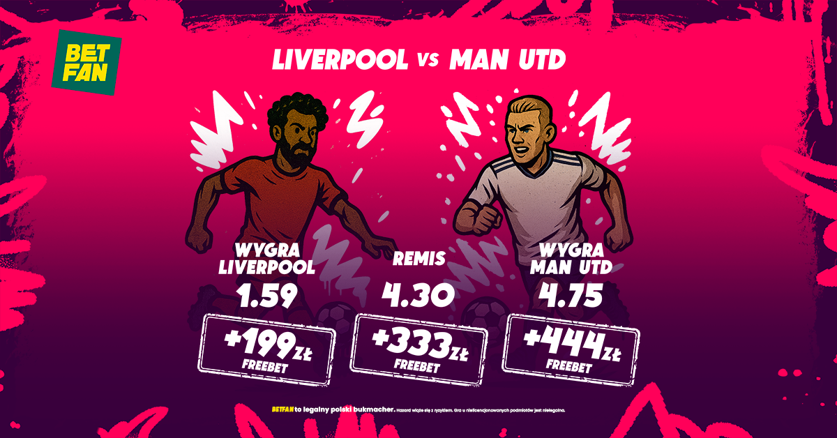 - Jeśli trafisz wyniku meczu, zgarniesz aż do 444 PLN bonusu od BETFAN (199 zł za zwycięstwo Liverpoolu, 333 zł za remis lub 444 zł za wygraną Manchesteru United).