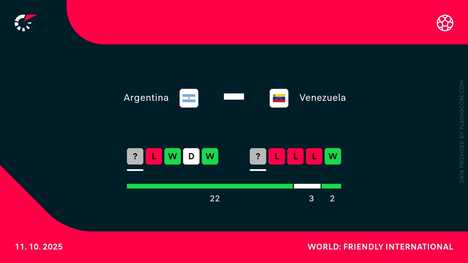 Wenezuela przegrała trzy poprzednie spotkania, co ostatecznie pogrzebało jej szansę na historyczny awans na mistrzostwa świata. Choć do końca zawodnicy tej reprezentacji walczyli choćby o udział w barażu interkontynentalnym, zajęli ósme miejsce w tabeli eliminacyjnej, natomiast ich ostatnie spotkania okazały się być dotkliwymi porażkami 3:6 z Kolumbią i 0:3 z Argentyną. Sparing z Albicelestes zostanie potraktowany jako możliwość pokazania się przed zawodnikami światowej klasy i nabranie doświadczenia.