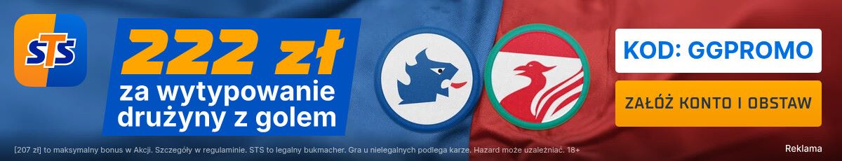 Kliknij w baner i załóż konto w STS z naszym kodem promocyjnym STS GRAMGRUBO. Wytypuj drużynę, która strzeli bramkę i zgarnij 222 zł bonusu.