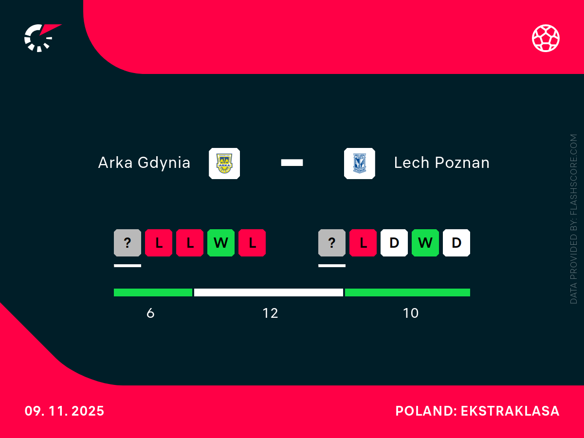 Arka Gdynia znajduje się aktualnie tylko jedno miejsce na strefą spadkową. Ekipa z północy Polski nie spisuje się ostatnio najlepiej, a w ostatnich czterech spotkaniach, tylko raz udało jej się zdobyć trzy punkty, po meczu wygranym 2:1 z ostatnim w tabeli ligowej Piastem. Defensywa Arki nie należy do najszczelniejszych, bowiem 17 bramek straconych w ostatnich 6 spotkaniach to nie jest wynik, który dobrze świadczyłby o postawie zespołu w obronie. Porażka 1:5 w meczu minionej kolejki obnażyła słabości Arki i Lech z pewnością będzie chciał je wykorzystać.