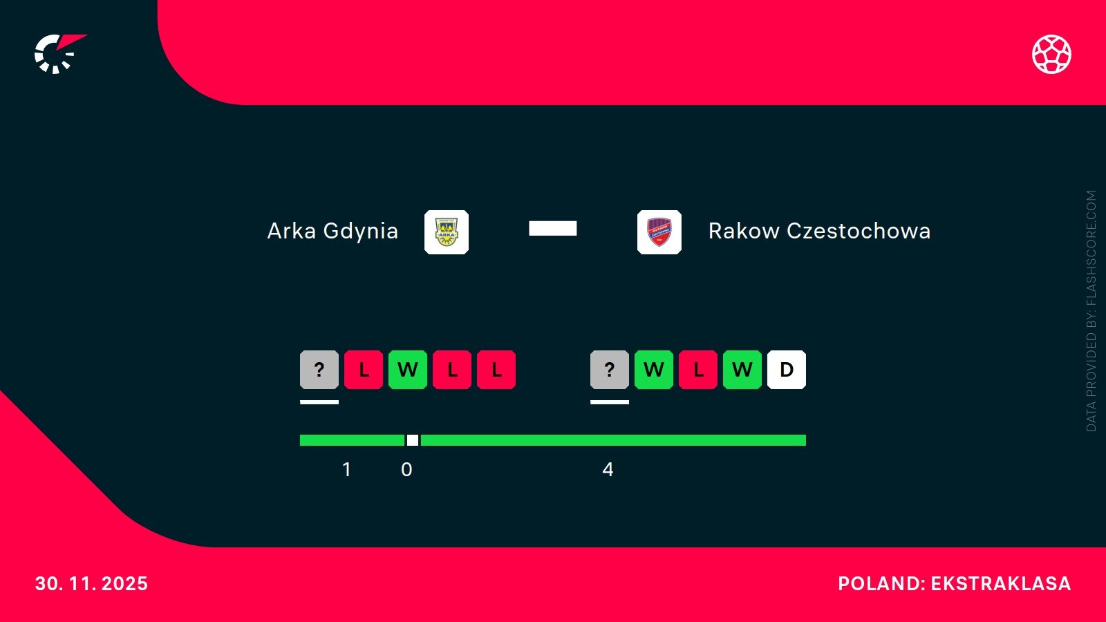 Raków Częstochowa jest w zupełnie innym nastroju. Do Gdyni przyjeżdżają prosto po efektownym triumfie nad Rapidem Wiedeń w Lidze Konferencji. W lidze, mimo wpadki z Piastem Gliwice u siebie, radzą sobie bardzo dobrze. Zwłaszcza ostatnimi czasy udaje się dobrze im grać na wyjazdach, co potwierdzają chociażby wygrane z Koroną czy Jagiellonią.