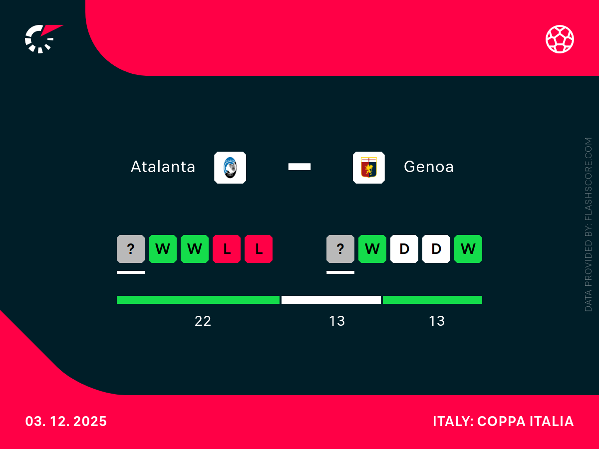 Genoa przyjeżdża do Bergamo, mając za sobą cztery kolejne mecze bez porażki, co jasno pokazuje, że pod wodzą De Rossiego drużyna odzyskała pewność siebie. Ekipa gra dość ofensywnie strzelając 9 bramek w ostatnich czterech spotkaniach, lecz także sporo traci, bo rywale trafiali do siatki w 12 na 13 ostatnich spotkań. Drużyna rozegrała dwa mecze w tej edycji Pucharu Włoch i w obu strzeliła trzy bramki, najpierw wygrywając 3:0 z L.R. Vicenza, a w kolejnej rundzie mierząc się z Empoli i ostatecznie zwyciężając 3:1.