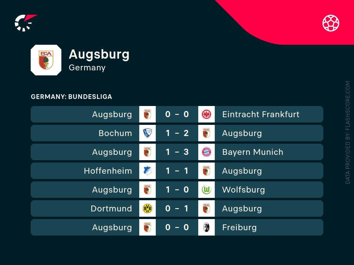 FC Augsburg w ostatnich pięciu spotkaniach zdobył osiem punktów, wygrywając dwa spotkania, dwukrotnie dzielił się punktami i przegrał na własnym stadionie z Bayernem Monachium (1:3).