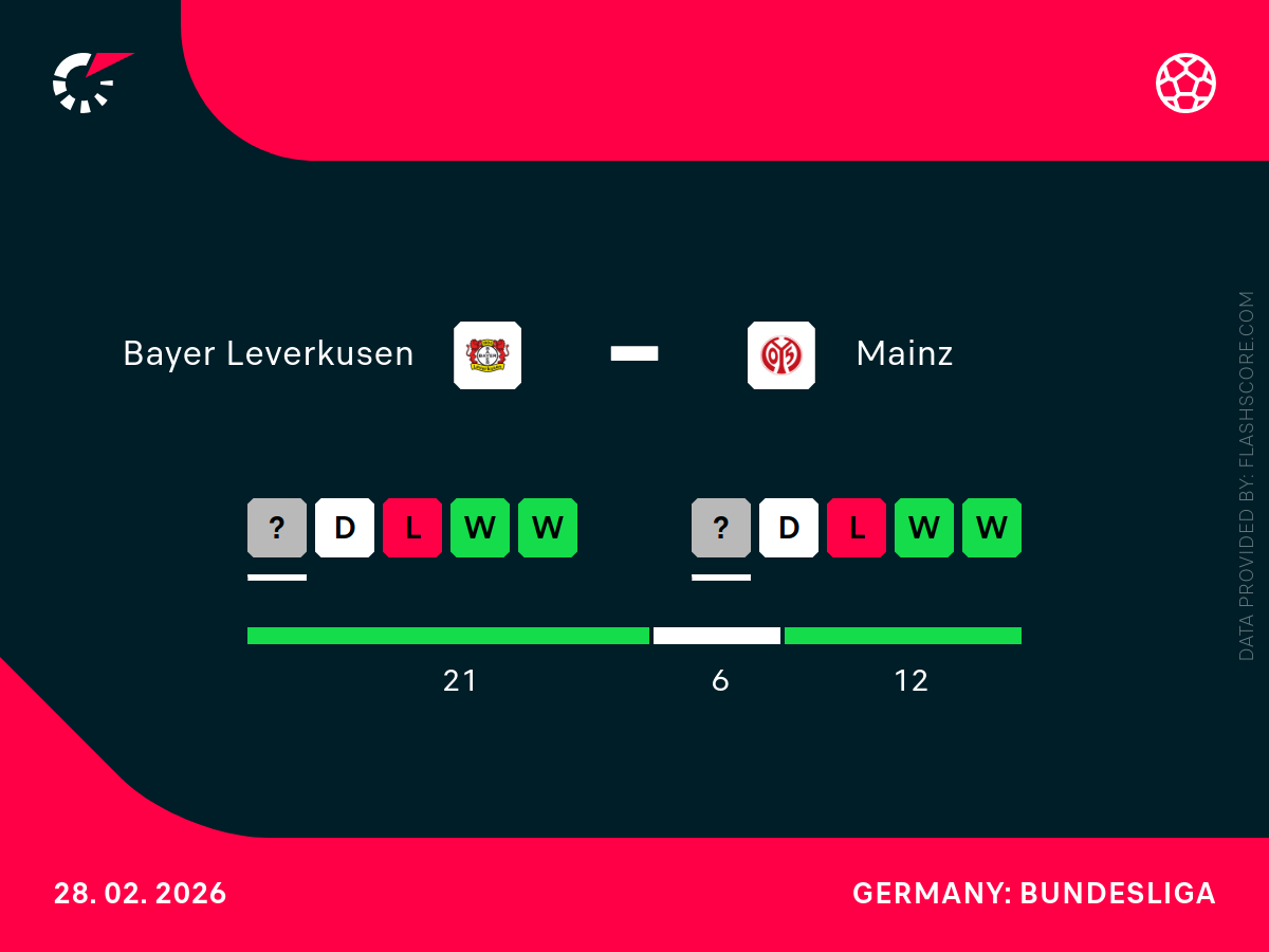 Gdzie obejrzeć transmisję z tego starcia? Mecz Bayer Leverkusen – Mainz odbędzie się na BayArenie w Leverkusen w sobotę 28 lutego o godzinie 15:30. Sędzią tego spotkania będzie niemiecki arbiter Tobias Stieler. Spotkanie Bundesligi będzie można obejrzeć na Eleven Sports 1 oraz Polsat Sport Premium 2. Udanego kibicowania.