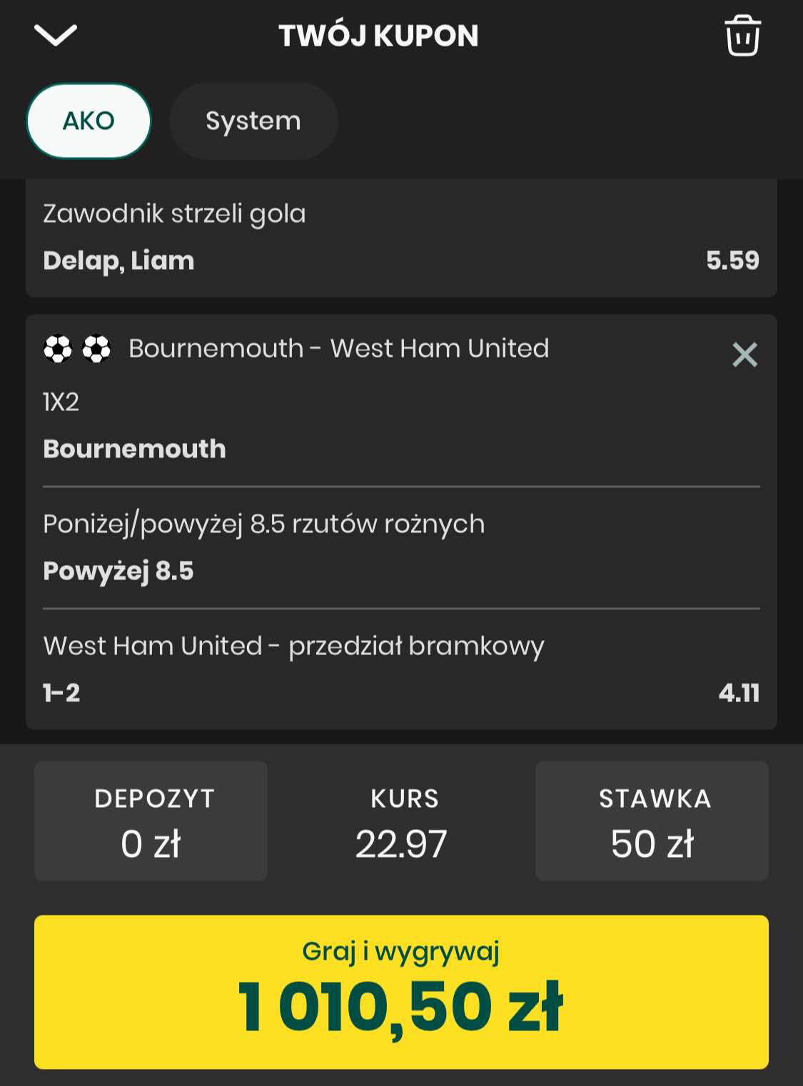 Po zrobieniu researchu, liderem w tej kategorii jest BETFAN. Pozwala on mieszać najwięcej wydarzeń z jednego meczu i zagrasz go na wiele sportowych zdarzeń. Bonusy od trzech pierwszych depozytów 100% do 200 PLN! Łącznie nawet 600 PLN bonusu tylko naszym kodem promocyjnym GRAMGRUBO w Betfan!