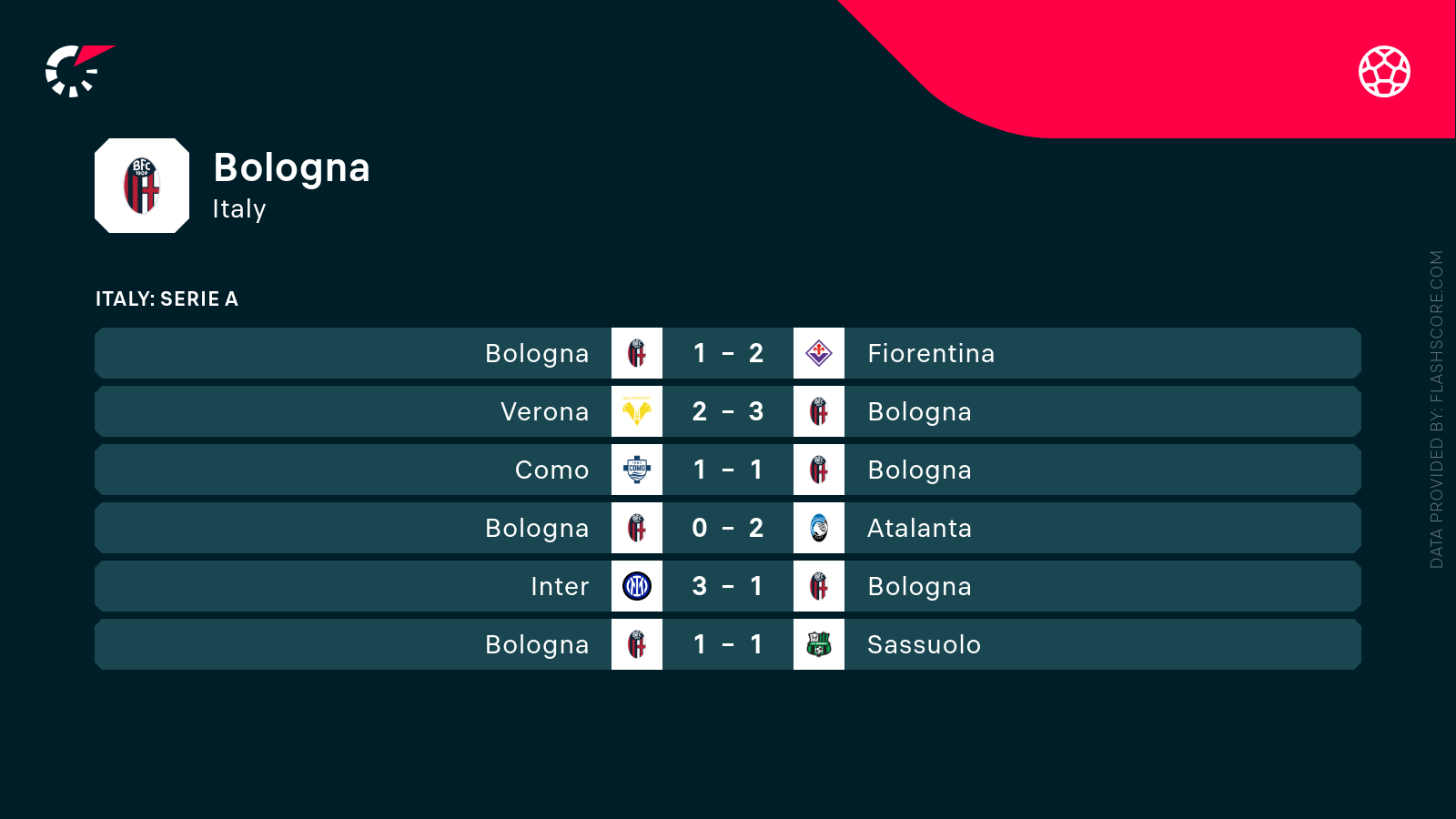 • 5 poprzednich meczów Bologny to 1 wygrana, 1 remis i 3 klęski.