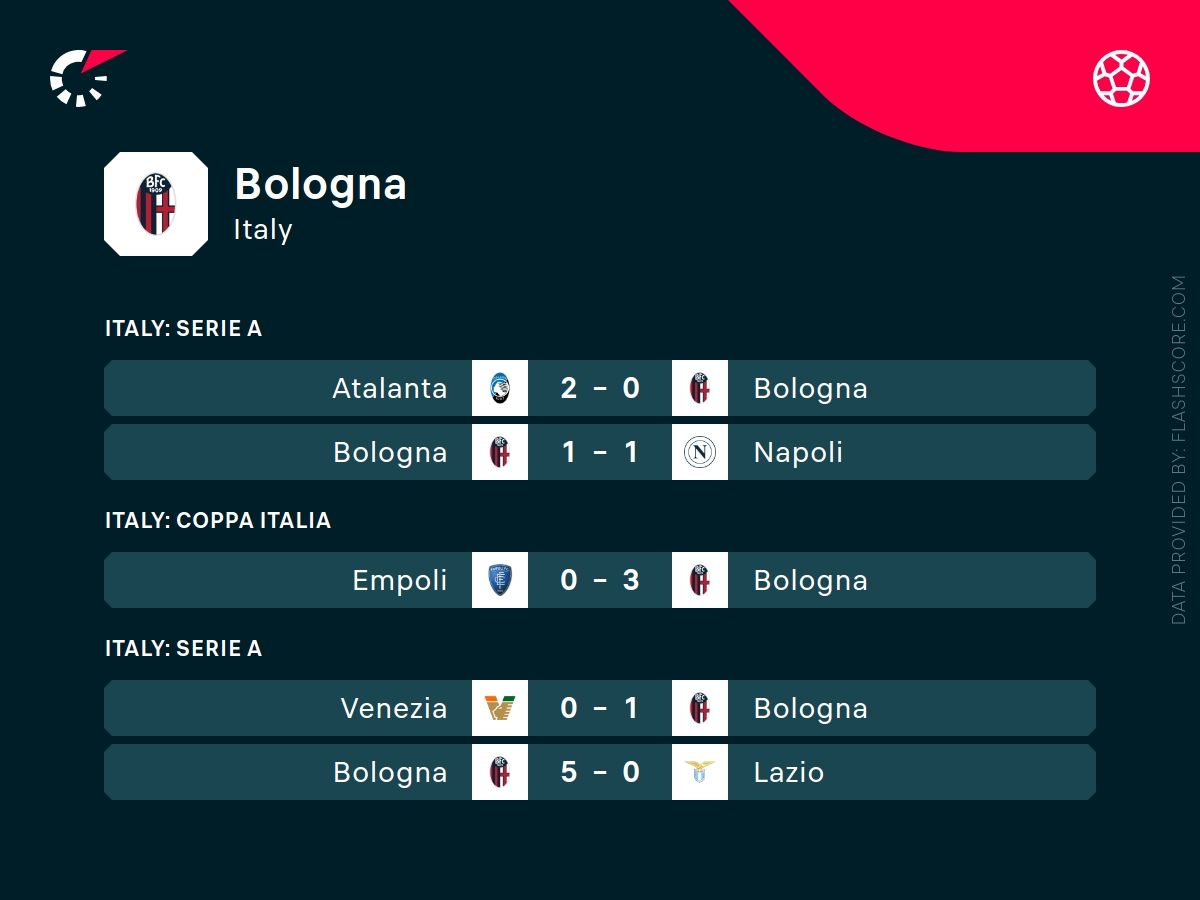 Bologna w ostatnich pięciu spotkaniach odniosła trzy zwycięstwa, jednak w ostatnich dwóch spotkaniach nie udało im się zdobyć kompletu punktów, zremisowali z Napoli 1:1, przegrali z Atalantą 2:0. Pomimo dobrej dyspozycji, zespół z Bolonii ma problem w pojedynkach z mocnymi rywalami.