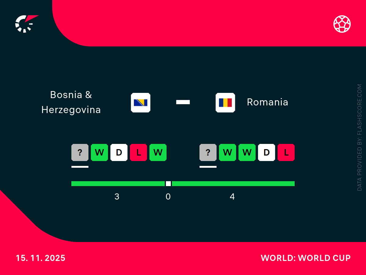 - Bośnia nie wygrała dwóch ostatnich meczów eliminacyjnych, a Rumunia nie przegrała od trzech