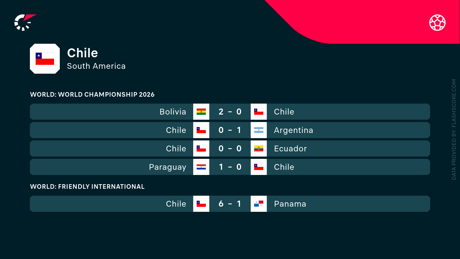 Chile: Gillier – Hormazabal, Maripan, Kuscević, Suazo – Osorio, Echeverria, Loyola – Tapia, Brereton Diaz, Aravena
