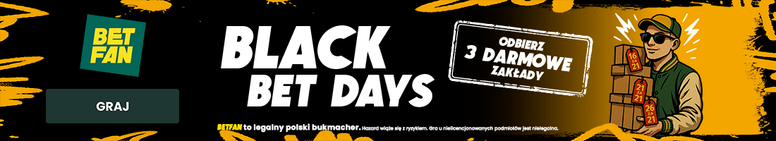W promce dla wszystkich z okazji Black Week w BETFAN jest „Black Bet Days”. Możesz w niej otrzymać aż trzy freebety! Grasz łącznie za 63 złote i otrzymujesz tyle samo w postaci darmowych zakładów. Kliknij w baner po szczegóły, a poniżej znajdziesz warunki promocji.