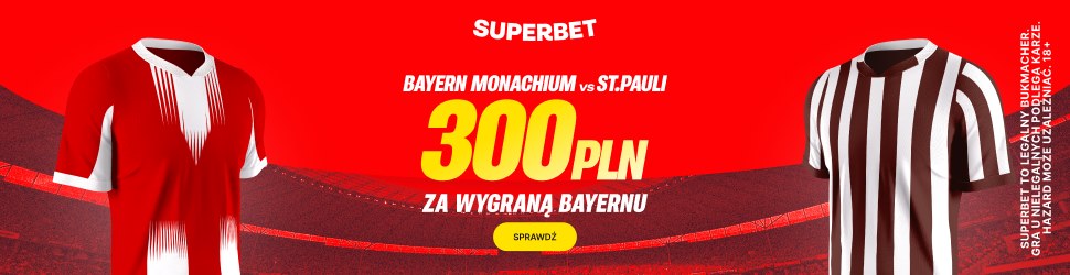 Superbet przygotował znakomitą promocję, z której możesz skorzystać najpóźniej do soboty do 15:30 – KURS 150 NA WYGRANĄ BAYERNU Z ST. PAULI. Promocja obowiązuje przy rejestracji z kodem promocyjnym Superbet „GRAMGRUBO”. Co ciekawe, łączy się ona z ofertą powitalną, a więc łącznie na start możesz mieć aż 4055 PLN!