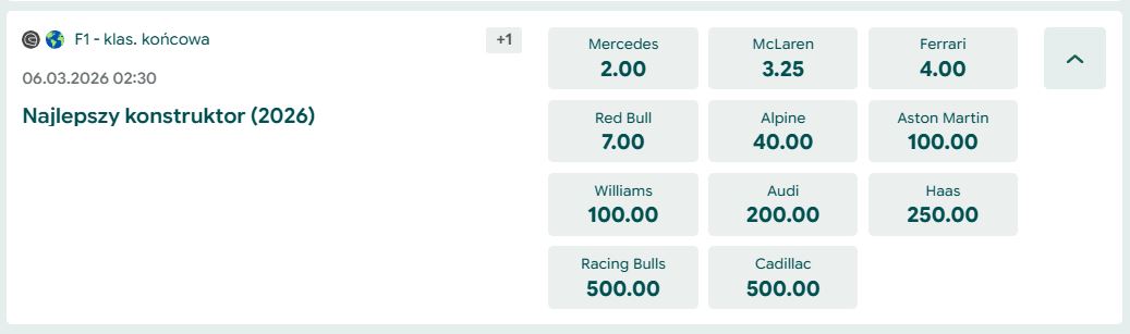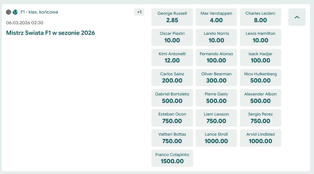 Z czego to wynika? Prawdopodobnie z zakulisowych informacji po zimowych testach. W Formule 1 jesteś tak dobry, jak twój najnowszy bolid, a wygląda na to, że rywale na sezon 2026 przygotowali absolutne potwory, przy których ubiegłoroczny mistrzowski samochód McLarena mógł dostać zadyszki. Niemniej jednak, dla kibiców Lando, kurs 10.00 na obrońcę tytułu to potężne value, obok którego trudno przejść obojętnie.