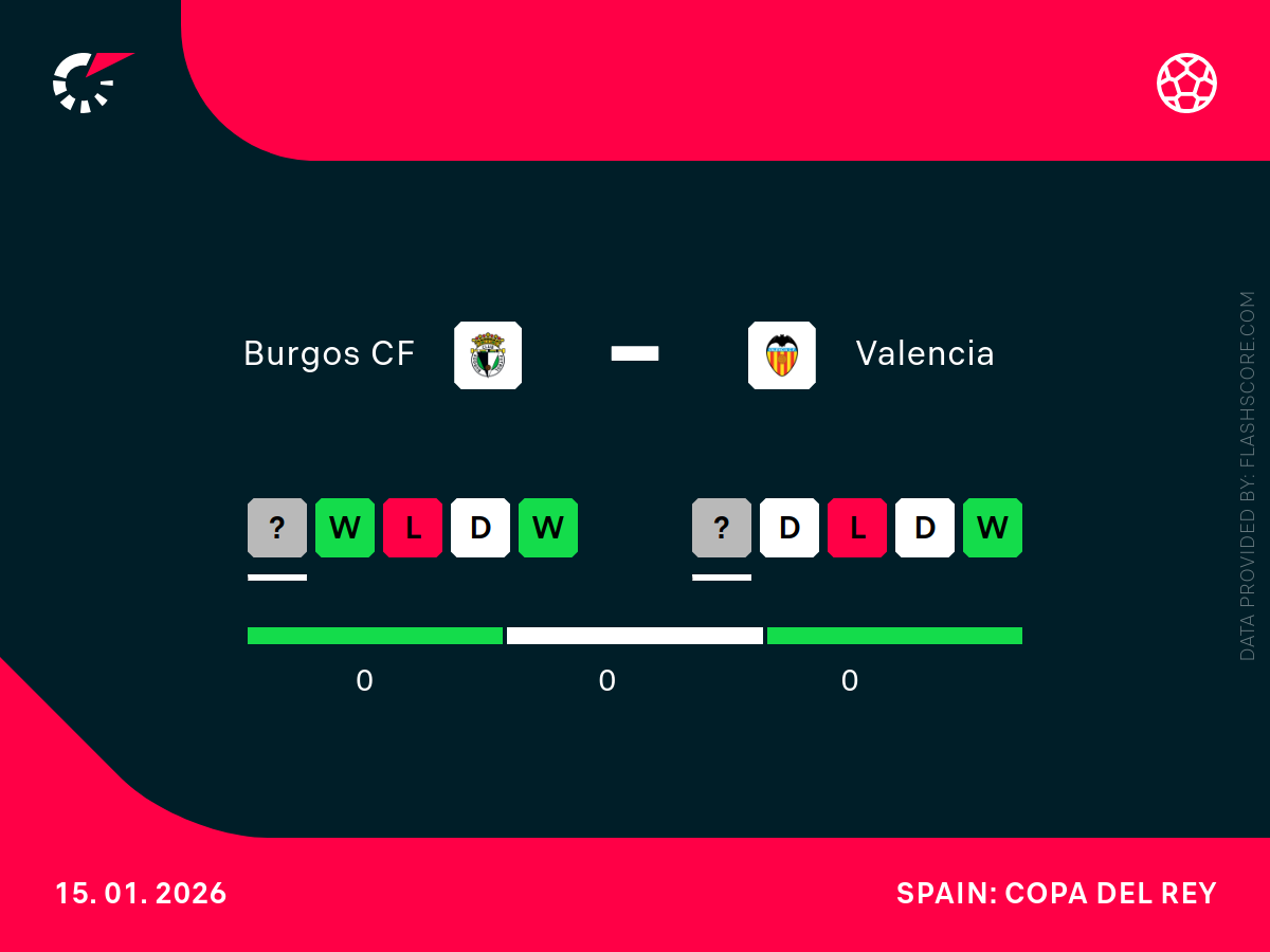 Valencia przyjeżdża do Burgos w nieco słabszych nastrojach, bo zajmuje 18. miejsce w La Lidze, czyli znajduje się w strefie spadkowej, do czego kibice drużyny nie są przyzwyczajeni. W sześciu ostatnich spotkaniach ligowych Valencii nie udało się odnieść zwycięstwa, jednak w Pucharze Króla sytuacja wygląda znacznie lepiej, bo drużyna wyeliminowała Cartagenę 2:1 po dogrywce, Maracenę po pewnym zwycięstwie 5:0 oraz Sporting Gijon wygrywając 2:0 w minionej rundzie rozgrywek. Valencia prezentuje ofensywne nastawienie, bo strzela gole już od 10 spotkań, jednak odsłania przez to obronę, przez co naraża się na utratę bramek, które traciła w ostatnich 7 na 8 meczów.
