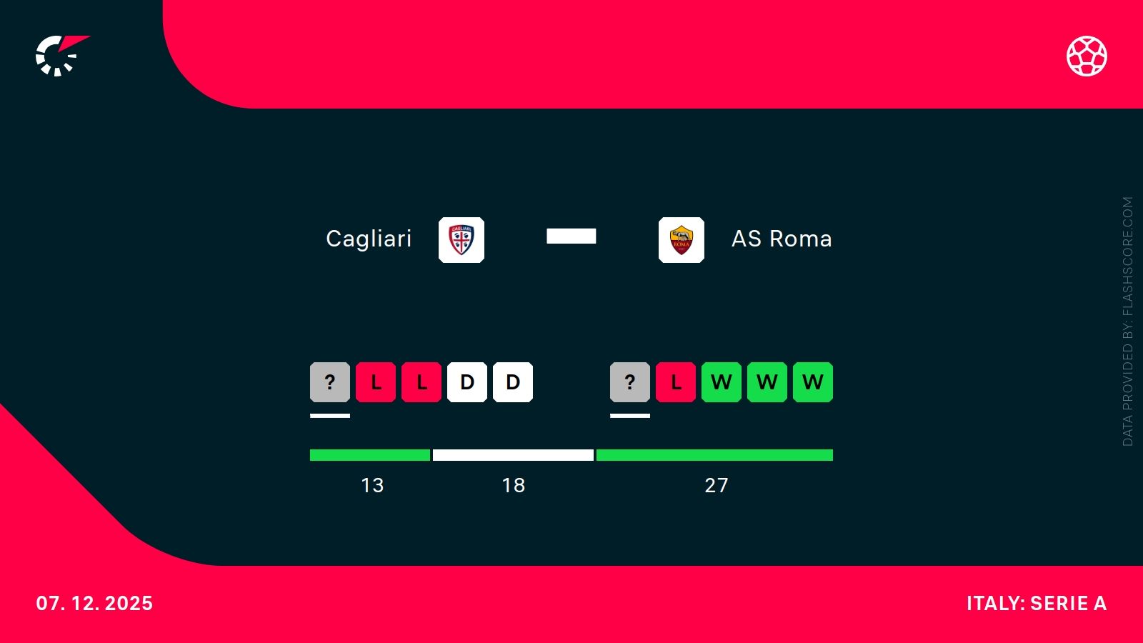 Cagliari znajduje się w kiepskiej dyspozycji, co idealnie obrazują ich ostatnie wyniki. Zespół nie zaznał smaku zwycięstwa w żadnym z pięciu ostatnich meczów. Poprzednia kolejka przyniosła im porażkę na własnym obiekcie z Napoli 1:2, przegrywając chociażby wcześniej z Juventusem i Lazio.
