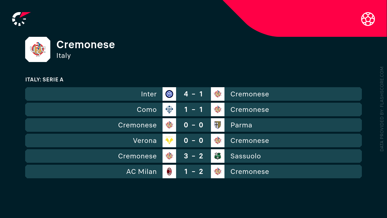 Drużyna Cremonese podczas sezonu 2025/26 upodobała sobie remisy, albowiem dzieliła się ona punktami w dokładnie połowie rozegranych spotkań ligowych! Generalnie wynik 9 zdobytych punktów i pozycja w okolicach środka tabeli to spory plus, ale z drugiej strony kibice na pewno nie przeżywają największych emocji oglądając spotkania z udziałem Cremonese. Jest to zespół nastawiony głównie na defensywę i bronienie korzystnego wyniku, oraz polegający na pojedynczych akcentach ofensywnych. W ostatniej kolejce nie miał on szans z Interem, z którym przegrał aż 1:4.