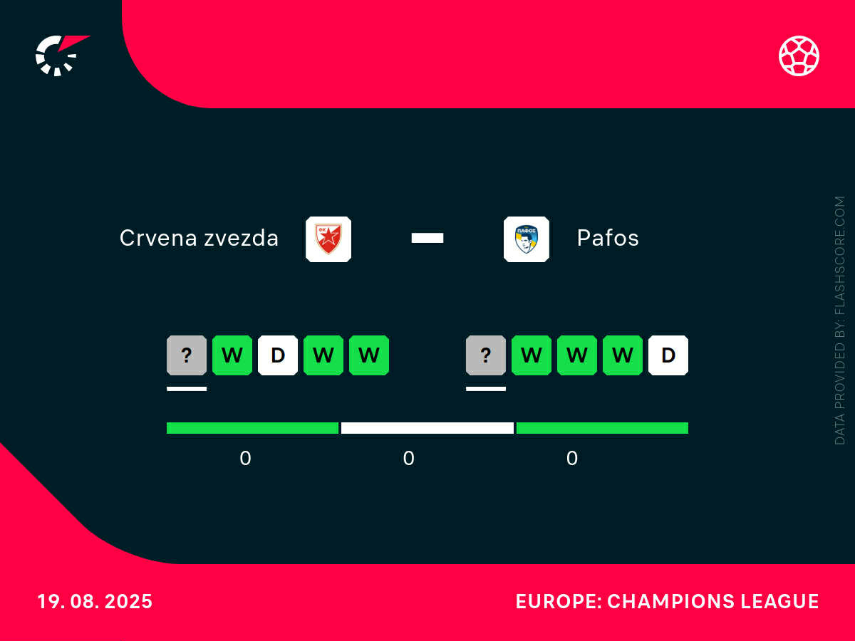 Pafos jest chyba najmniej znanym powszechnie klubem w ostatniej fazie tegorocznych kwalifikacji Ligi Mistrzów. Jest to jednak konsekwentnie budowany od lat zespół za duże zagraniczne pieniądze.  Cypryjski zespół prezentuje wyśmienitą formę, a jego ostatnie wyniki mogą zachwycić. Ich największym osiągnięciem było wyeliminowanie w poprzedniej rundzie faworyzowanego Dynama Kijów. Pafos pokonało ukraiński zespół dwukrotnie, najpierw 1:0 na wyjeździe w Lublinie, a następnie 2:0 u siebie. Wcześniej wyeliminowali również silne Maccabi Tel Awiw, wygrywając kluczowy mecz, gościnnie rozgrywany w Serbii, 1:0. Pafos jest niepokonane w tej edycji pucharów, a ich pewność siebie rośnie z każdym meczem. Do Belgradu przylatują w szczytowej dyspozycji i z wiarą w sprawienie kolejnej sensacji.