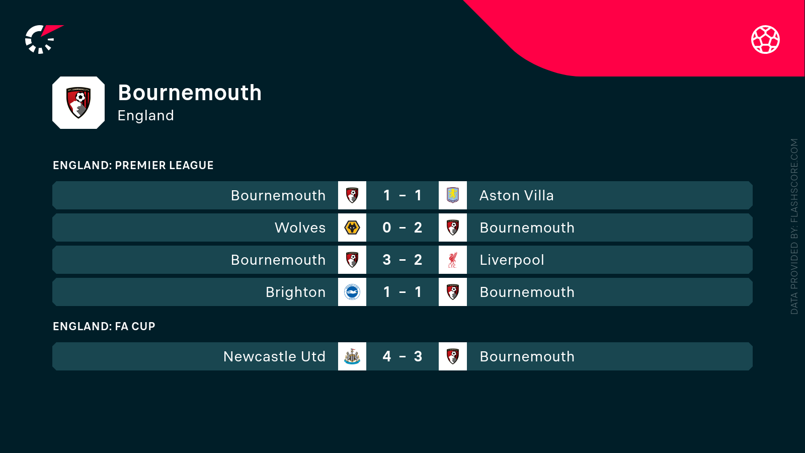 Bournemouth: Petrović – Jimenez, Hill, Senesi, Truffert – Scott, Cook – Rayan, Kroupi, Adli – Evanilson