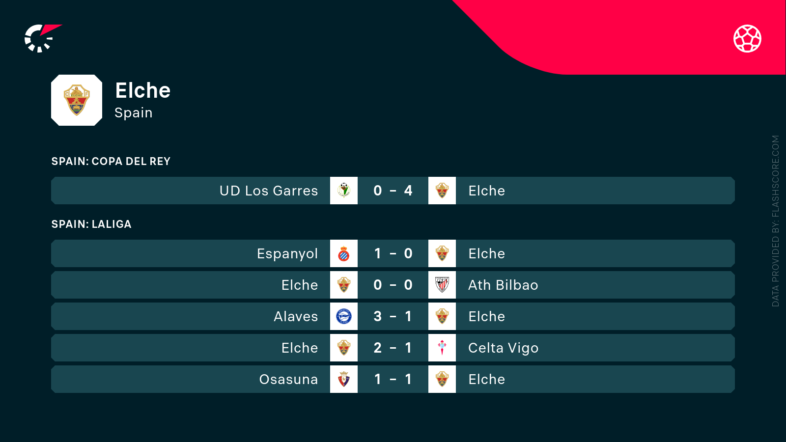 - 5 poprzednich spotkań ligowych Elche to 1 wygrana, 2 remisy i 2 klęski.