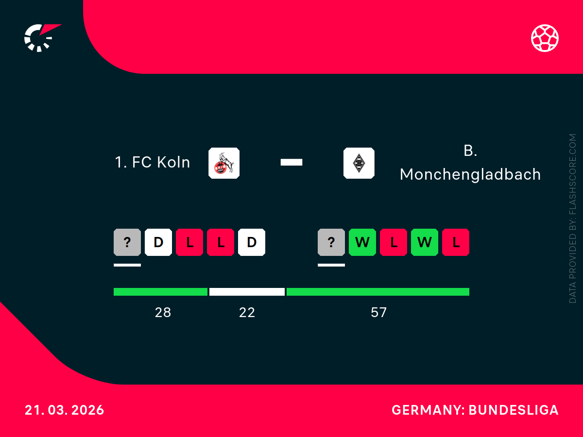 - FC Koeln wygrało lub zremisowało 3 z ostatnich 4 bezpośrednich meczów ligowych z tym rywalem na własnym stadionie.