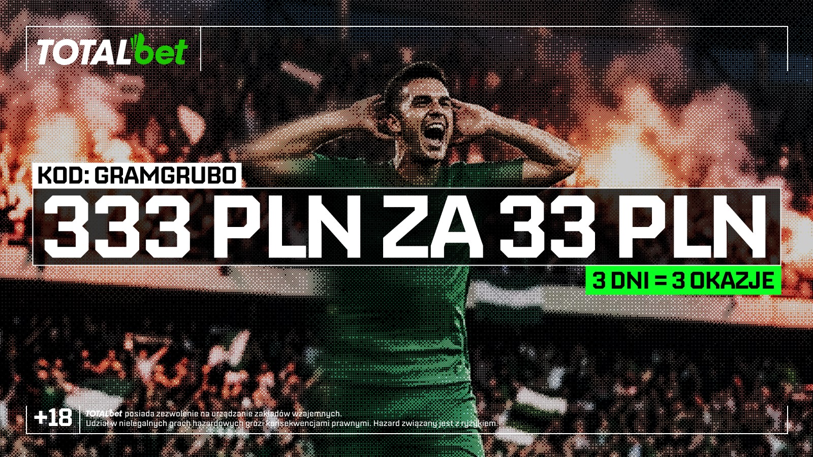 Ruszyła potężna promocja w TOTALbet, w której do zgarnięcia jest aż 999 PLN w darmowych zakładach. Używając kodu GRAMGRUBO, wchodzisz do gry o trzy potężne freebety, z których każdy ma wartość 333 PLN. To jedna z tych ofert, obok których nie da się przejść obojętnie, jeśli szukasz konkretnego value u legalnych bukmacherów.