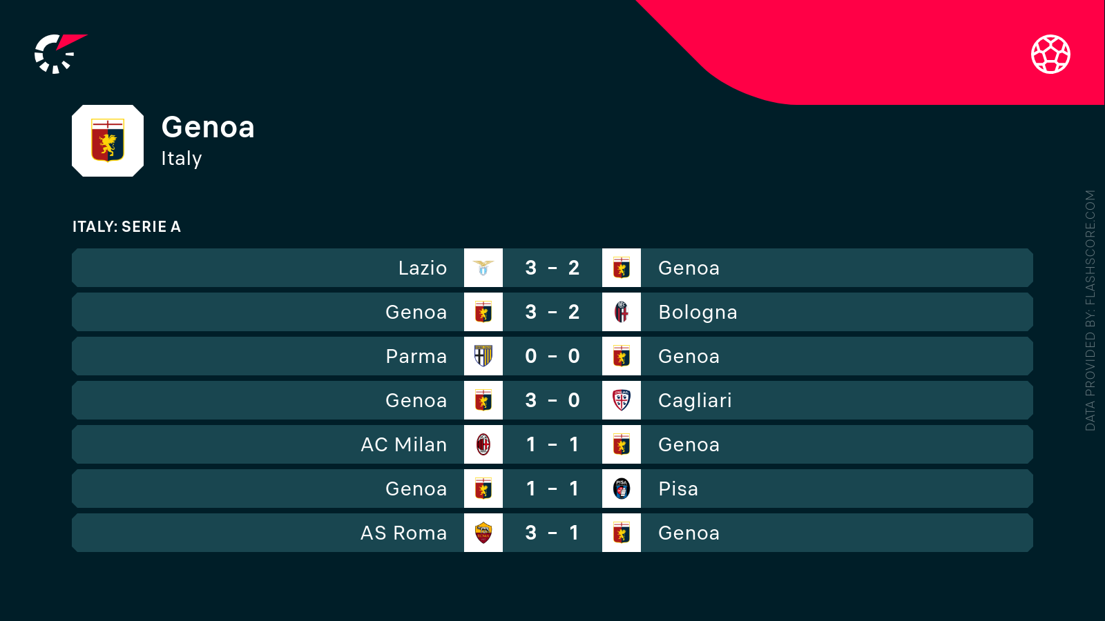 Ekipa Genoi w ostatnich tygodniach zrobiła bardzo wiele, aby poprawić swoją sytuację i oddalić się nieco od strefy spadkowej. W 5 poprzednich kolejkach doznała tylko 1 porażki przeciwko Lazio, z którym i tak stoczyła niezłe i wyrównane spotkanie. Oprócz tego była w stanie zremisować z AC Milanem 1:1, czy ograć Bolognę aż 3:0. W rezultacie wspomnianych sukcesów przewaga nad strefą spadkową wzrosła do 6 oczek, a zespół nieco odetchnął. Na plus również niezła sytuacja kadrowa, bo trener De Rossi może korzystać z usług niemal wszystkich piłkarzy.