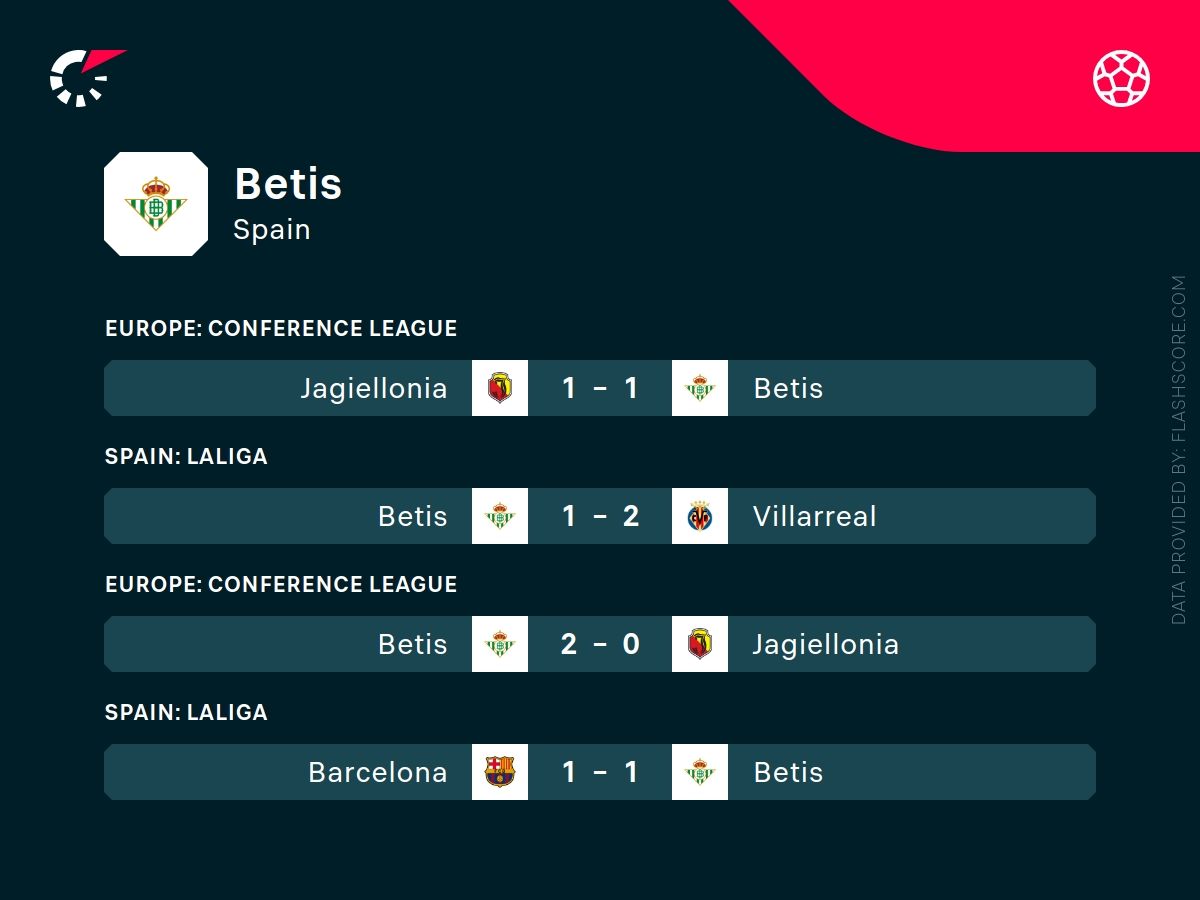 Real Betis przeszedł w ostatnim czasie do półfinału Ligi Konferencji, eliminując z tych rozgrywek Jagiellonię Białystok. Wygrali trzy z ostatnich pięciu meczów ligowych, jedno spotkanie zremisowali i przegrali z Villarealem (1:2).
