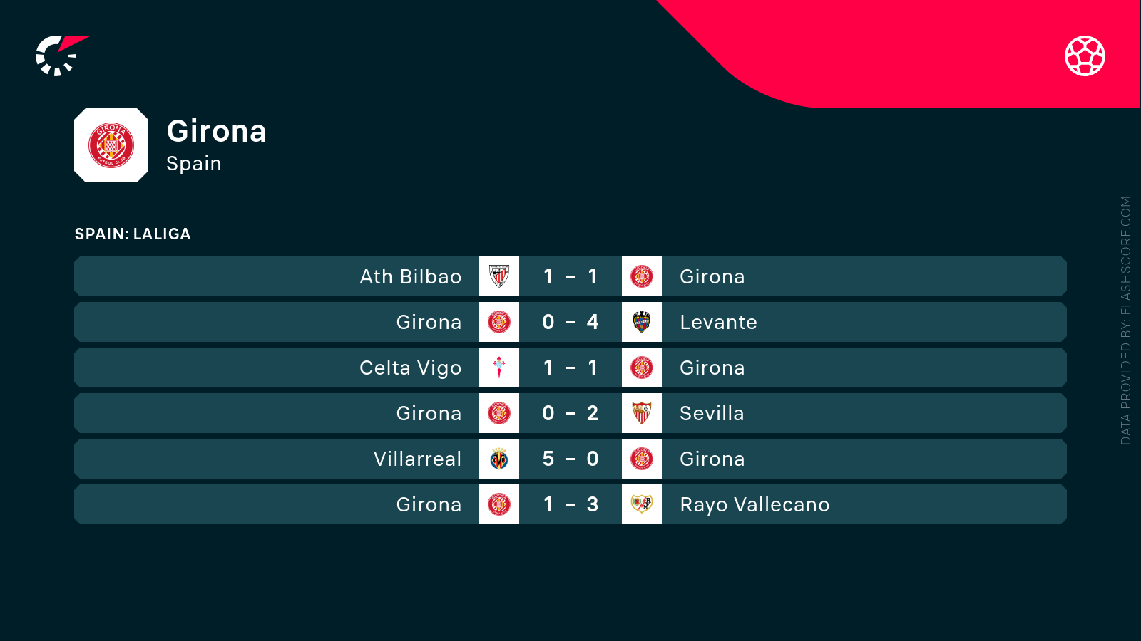 W naszych typach dnia wielokrotnie analizowaliśmy spotkania Girony i pisaliśmy już o jej beznadziejnej formie. Być może się zatem powtórzę, ale Katalończycy to jedno z największych rozczarowań tego sezonu w Europie. Girona zamyka obecnie ligową tabelę i ma na koncie ledwie 2 punkty po 2 remisach. Podopieczni trenera Michela w poprzedniej kolejce zyskali cenne oczko za sprawą remisu 1:1 z Athletikiem Bilbao. Dodajmy również, że omawiana ekipa ma na swoim koncie już 16 straconych bramek i jest to najsłabszy wynik La Liga.