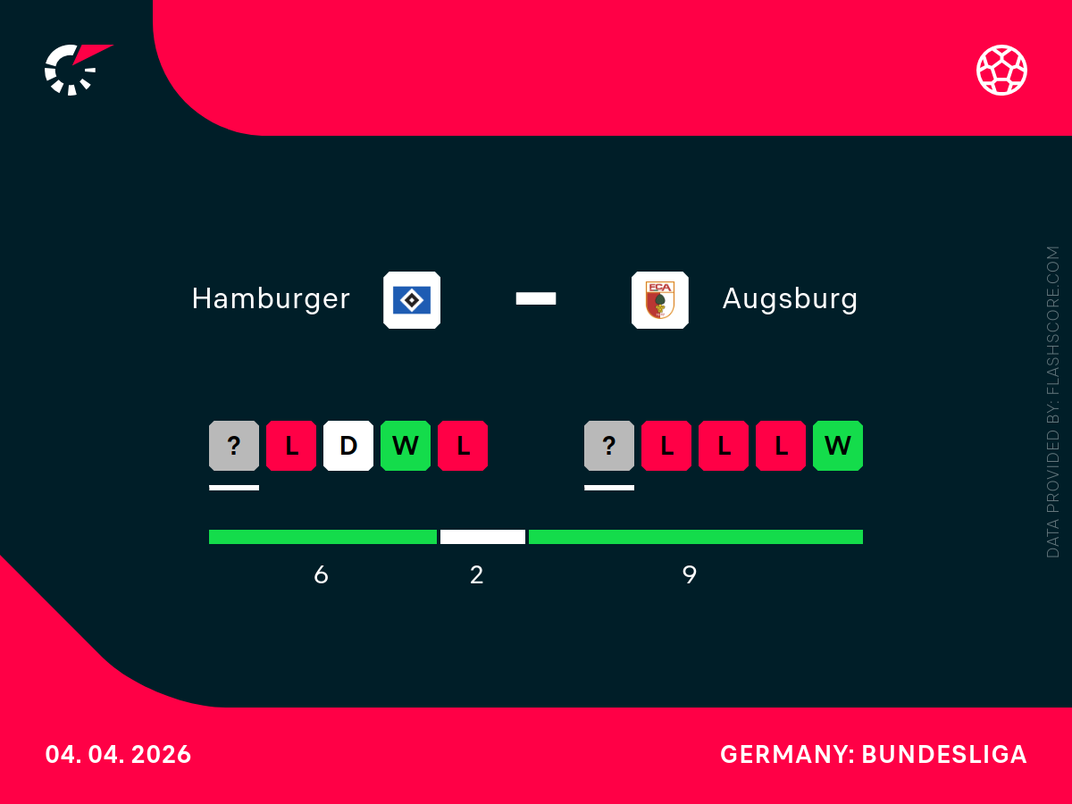- FC Augsburg wygrał ostatnie bezpośrednie spotkanie z Hamburgerem SV wynikiem 1:0.
