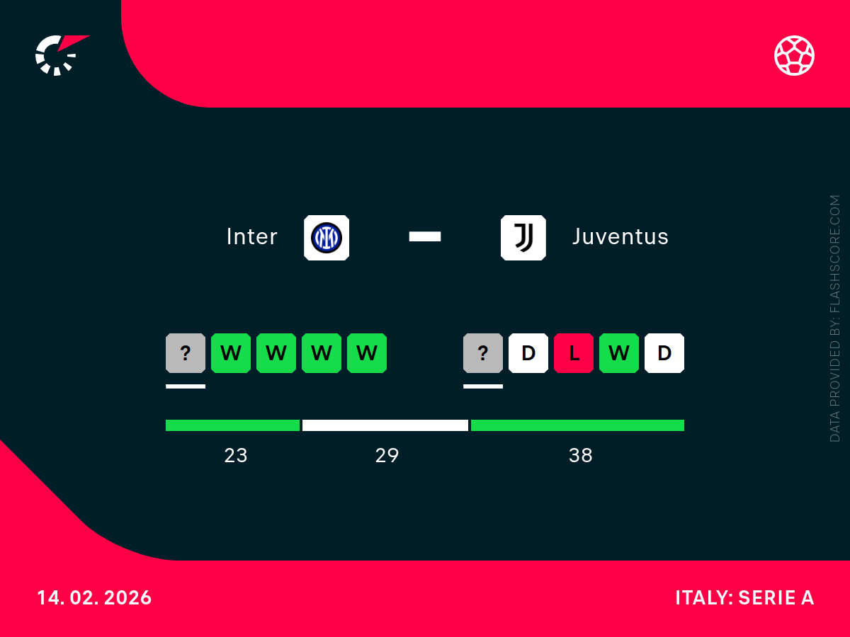 Juventus zajmuje czwarte miejsce tabeli i traci do lidera aż dwanaście punktów. Zespół prowadzony przez Luciano Spallettiego prezentuje ofensywny styl gry, zdobywając 23 bramki w ostatnich dziesięciu meczach ligowych, jednak ostatnie występy mogą budzić pewne wątpliwości. W ostatniej kolejce Serie A, Juve zremisowało 2:2 z Lazio po golu Kalulu w doliczonym czasie gry, a mecz wcześniej Stara Dama pożegnała się z pucharem Włoch, przegrywając 0:3 z Atalantą. Na wyjazdach Juventus bywa niestabilny i w kilku ostatnich spotkaniach miał problemy ze zdobywaniem bramek, bo w czterech ostatnich meczach w delegacji, Stara Dama zdobyła zaledwie jednego gola. Mimo, że dwa ostatni starcia z Interem zakończyły się wygraną Juventusu, to goście mają wyraźne problemy z grą na obcym terenie.