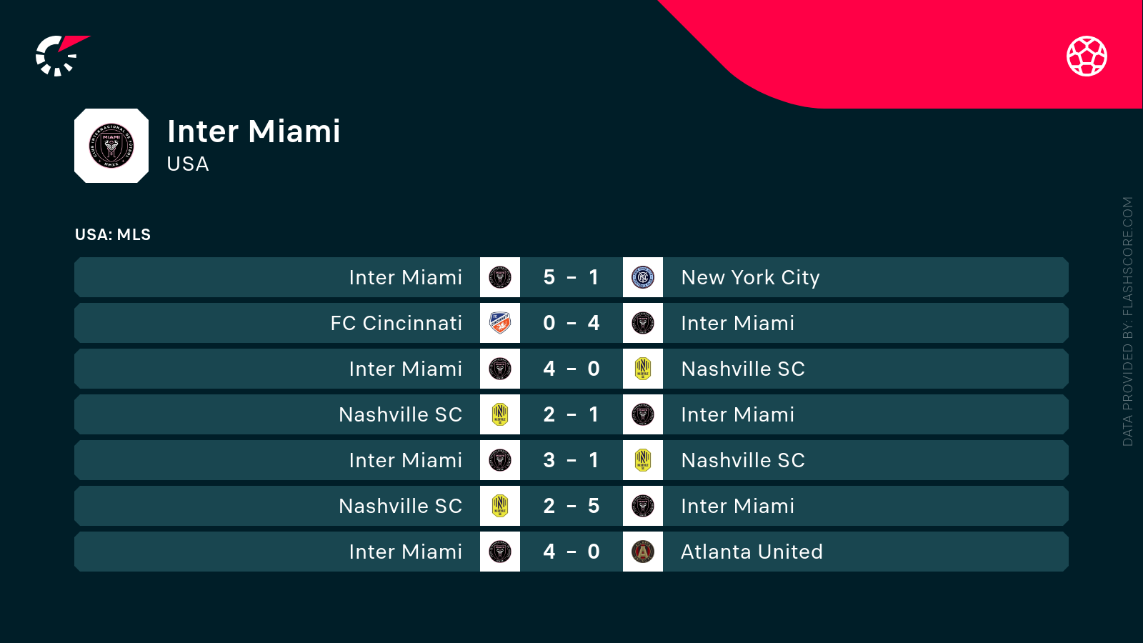- 5 ostatnich meczów Interu Miami to 4 wygrane i 1 porażka.