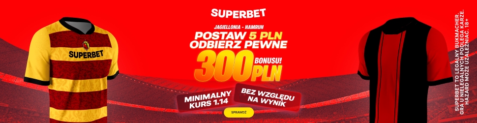 AŻ 4055 ZŁOTYCH ZA MECZ JAGIELLONII W SUPERBET! Postaw 5 zł i odbierz pewne 300 PLN bez względu na wynik kuponu! KLIKNIJ TUTAJ albo w baner poniżej, aby przejść do promocji!