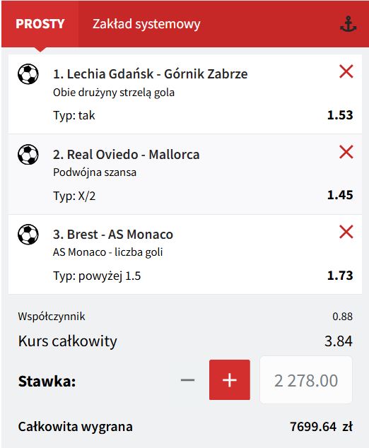 - 🎯 Rekomendowana stawka: 2 274 zł (aby otrzymać 1 000 zł na konto główne w przypadku niepowodzenia)