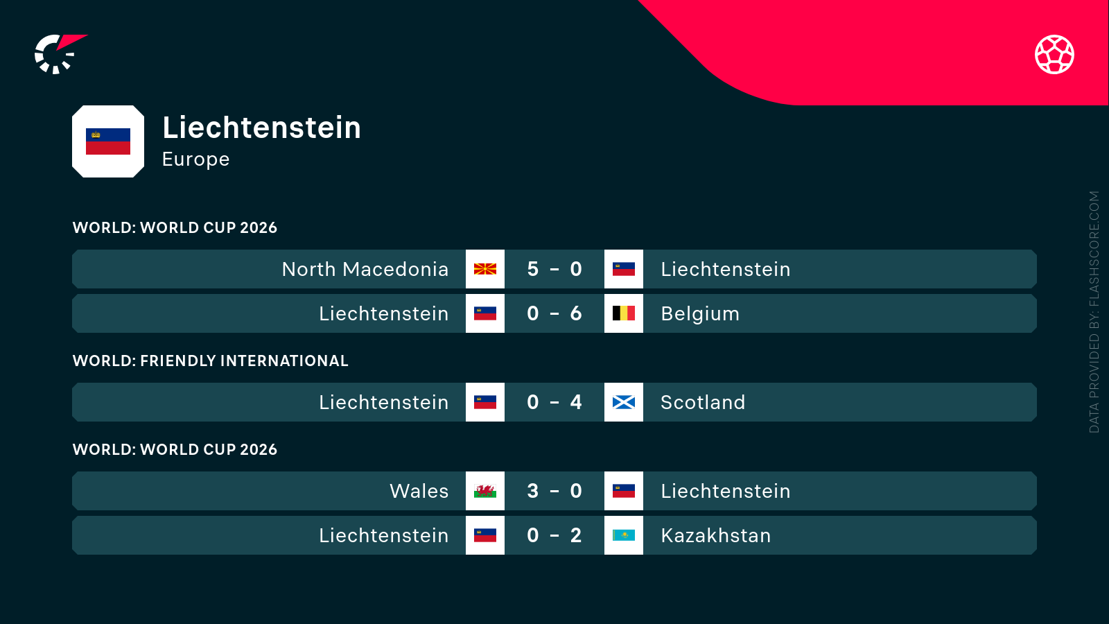 • Liechtenstein to 5. zespół eliminacji, ma na koncie 0 punktów.