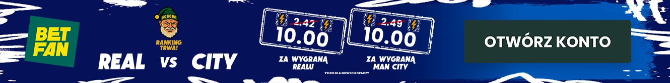 Przy współpracy z BETFAN, mamy znakomitą promocję dla graczy, którzy zarejestrują się z kodem promocyjnym BETFAN GRAMGRUBO – podwyższony kurs na wygraną Realu albo Manchesteru City po kursie 10.00! Co ciekawe, otrzymasz także bonus 100% do 50 PLN i możesz wziąć udział w rankingu z nagrodami rzeczowymi (Iphone 17 Pro, PS5 Pro i inne). Szczegóły promocji poniżej.