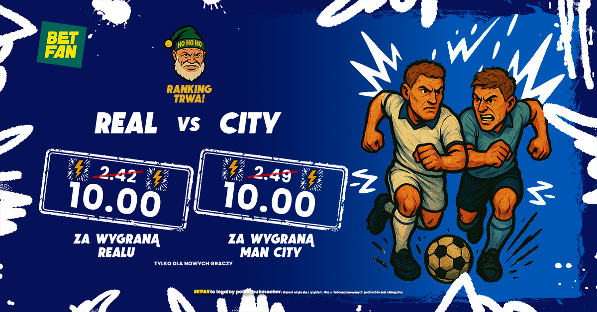 Przy współpracy z BETFAN, mamy znakomitą promocję dla graczy, którzy zarejestrują się z kodem promocyjnym BETFAN GRAMGRUBO – podwyższony kurs na wygraną Realu albo Manchesteru City po kursie 10.00! Co ciekawe, otrzymasz także bonus 100% do 50 PLN i możesz wziąć udział w rankingu z nagrodami rzeczowymi (Iphone 17 Pro, PS5 Pro i inne). Szczegóły promocji poniżej.