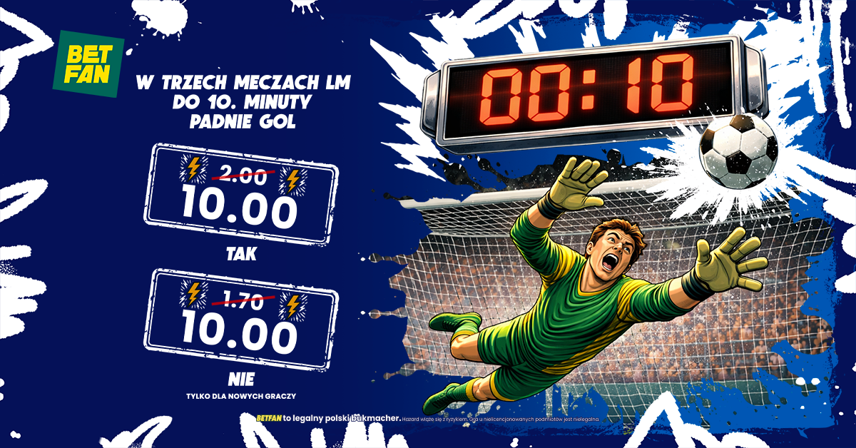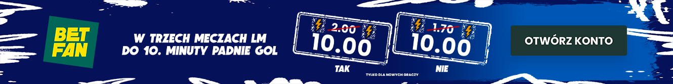 BETFAN przygotował z okazji Ligi Mistrzów specjalną promocję. Polski legalny bukmacher daje możliwość zagrania gola do 10 minuty po mega kursie 10.00! Co ciekawe, promocja łączy się z bonusem powitalnym, a więc otrzymasz bonus od depozytu i freebet 25 zł (przy wpłacie min 75 zł)! Dodatkowo możesz skorzystać z bonusów 100% do 200 PLN także od drugiej i trzeciej wpłaty. Promocja dostępna jest dla nowych graczy, którzy założą konto z kodem GRAMGRUBO. To najwyższy bonus na rynku!