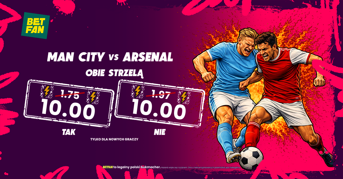 BETFAN przygotował z tej okazji specjalną promocję. Polski legalny bukmacher daje możliwość zagrania zakładu na to czy obie strzelą (TAK/NIE) w meczu Manchester City – Arsenal po mega kursie 10.00! Wygraną otrzymujesz na konto główne. Co ciekawe, promocja łączy się z bonusem powitalnym, a więc otrzymasz bonus od depozytu i freebet 25 zł (przy wpłacie min. 75 zł)! Dodatkowo możesz skorzystać z bonusów 100% do 200 PLN także od drugiej i trzeciej wpłaty. Promocja dostępna jest dla nowych graczy, którzy założą konto z kodem GRAMGRUBO. To najwyższy bonus na rynku!