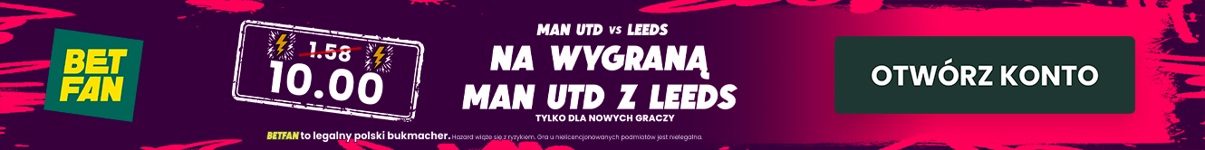 Przy współpracy z liderem rankingu bukmacherów BETFAN, mamy znakomitą promocję dla graczy, którzy zarejestrują się z kodem promocyjnym BETFAN GRAMGRUBO – możliwość zagrania zakładu na wygraną Manchesteru United z Leeds po mega kursie 10.00, ponadto otrzymasz bonus od 1. depozytu 100% do 200 PLN (+ freebet 25 zł przy wpłacie min. 75 zł) , a także będziesz mógł skorzystać z bonusów 100% do 200 PLN od drugiego i trzeciego depozytu!