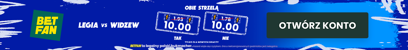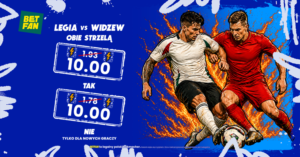 BETFAN przygotował z tej okazji specjalną promocję. Polski legalny bukmacher daje możliwość zagrania zakładu na to czy obie strzelą w meczu Legia – Widzew po mega kursie 10.00! Wygraną otrzymujesz na konto główne. Co ciekawe, promocja łączy się z bonusem powitalnym, a więc otrzymasz bonus od depozytu i freebet 25 zł (przy wpłacie min. 75 zł)! Dodatkowo możesz skorzystać z bonusów 100% do 200 PLN także od drugiej i trzeciej wpłaty. Promocja dostępna jest dla nowych graczy, którzy założą konto z kodem GRAMGRUBO. To najwyższy bonus na rynku!