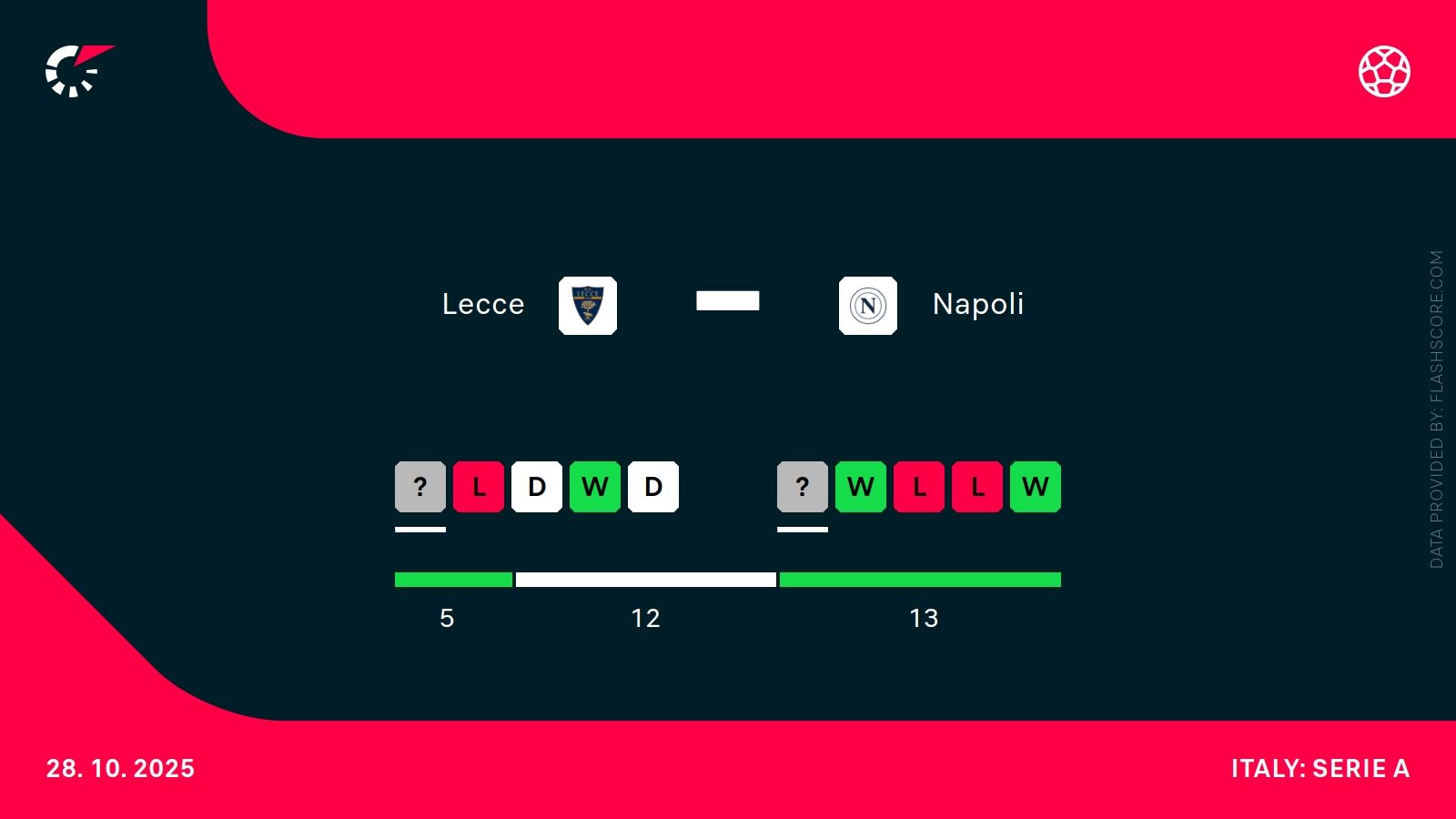 Lecce znajduje się w trudnym momencie sezonu. Zajmują miejsce tuż nad strefą spadkową, a na własnym stadionie nie odnieśli jeszcze zwycięstwa. Co gorsza w ośmiu ostatnich meczach przegrali aż pięciokrotnie. Jedynym promyczkiem nadziei była wygrana 1:0 na wyjeździe z Parmą. Drużyna musi poprawić grę z przodu, jeśli nie chce zasilić szeregów Serie B.