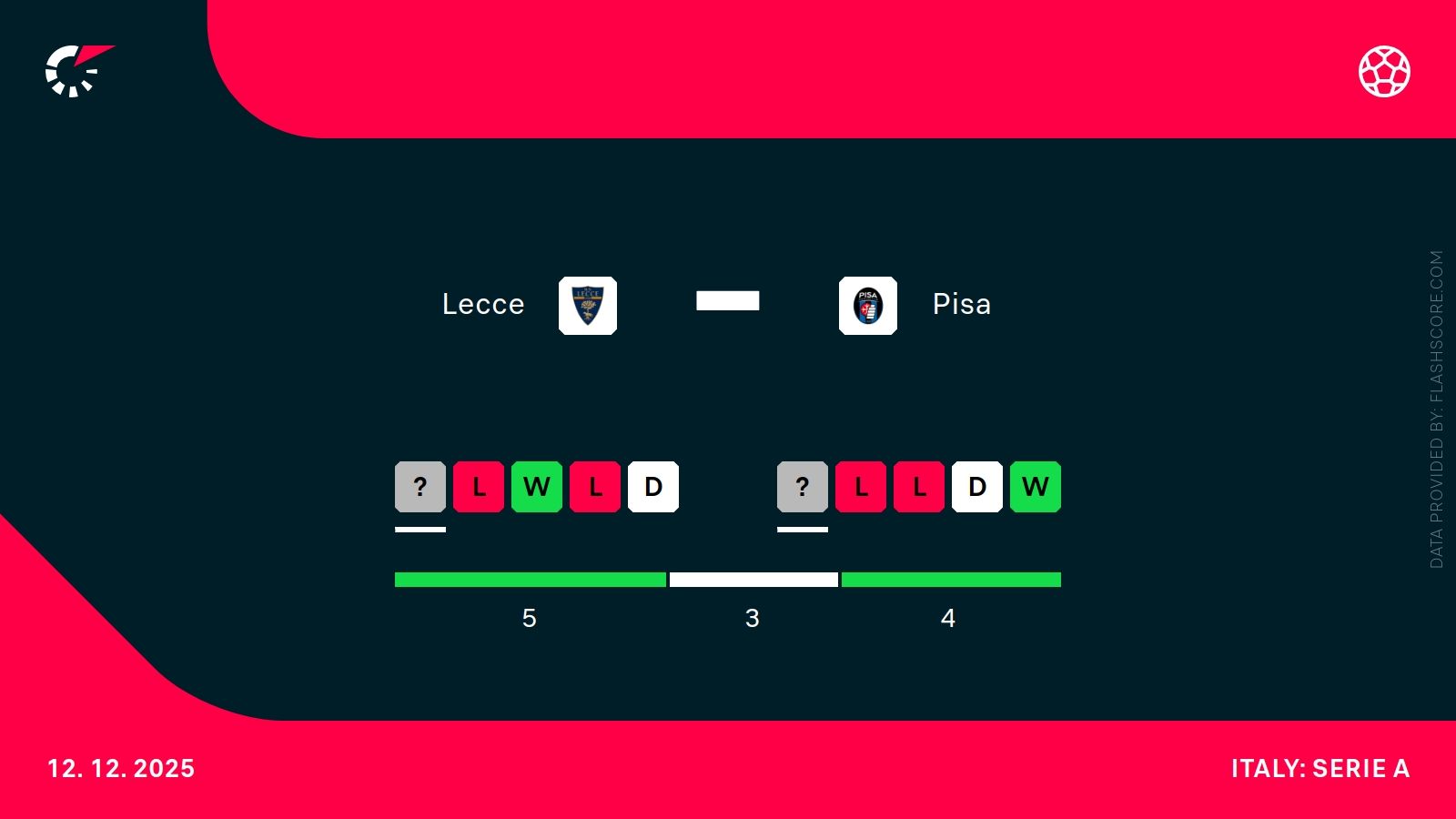 Gdzie obejrzeć transmisję z tego starcia? Mecz Lecce – Pisa odbędzie się na Stadio Via del Mare w Lecce, 12 grudnia o godzinie 20:45. Spotkanie będzie można oglądać na antenie Eleven Sports 2. Wynik będzie można śledzić na stronie flashscore.com oraz w aplikacji Flashscore.