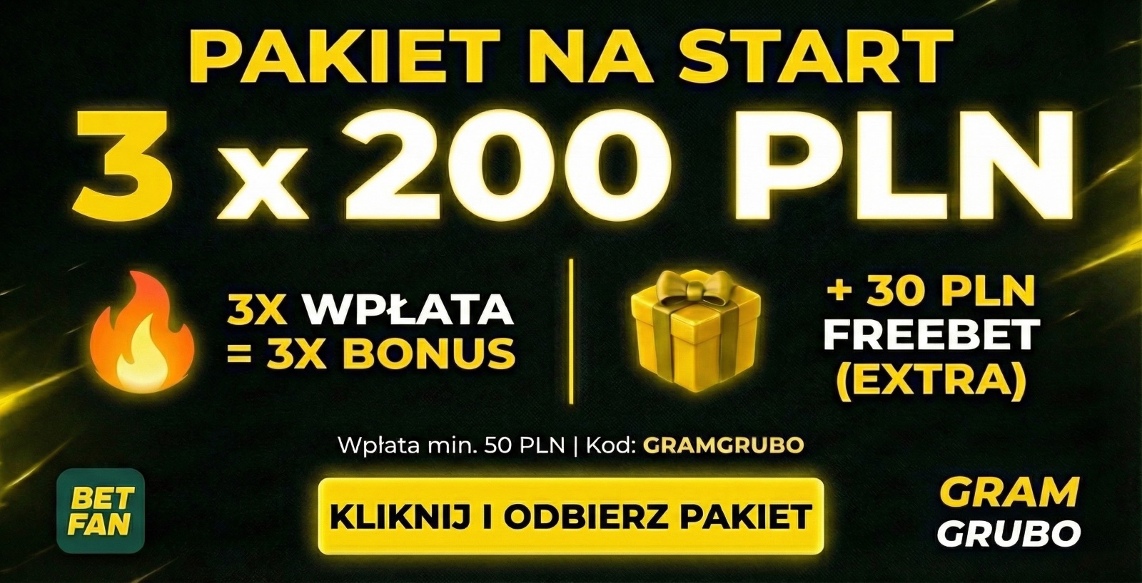 Najnowszy bonus powitalny BETFAN to trzy bonusy od depozytu po 100% do 200 PLN i freebet 30 złotych. Takie benefity zgarniesz rejestrując się z kodem GRAMGRUBO. Jest to najwyższy bonus w BETFAN na rynku.