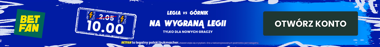 Załóż konto z kodem promocyjnym Betfan GRAMGRUBO i obstaw zwycięstwo Legii Warszawa po kursie 10.00, oraz zgarnij najwyższy pakiet startowy o łącznej wartości 625 zł!